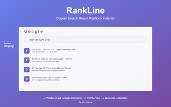 RankLine is een handige browserextensie voor Google Chrome die gebruikers helpt bij het snel identificeren van zoekresultaatposities. Deze gratis add-on toont elegante genummerde badges naast elk zoekresultaat, waardoor het eenvoudig wordt om de rangschikking in één oogopslag te volgen. Het is een waardevol hulpmiddel voor SEO-professionals, marketeers en onderzoekers die zich bezighouden met zoekmachineoptimalisatie en concurrentieanalyse.